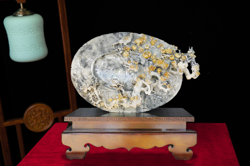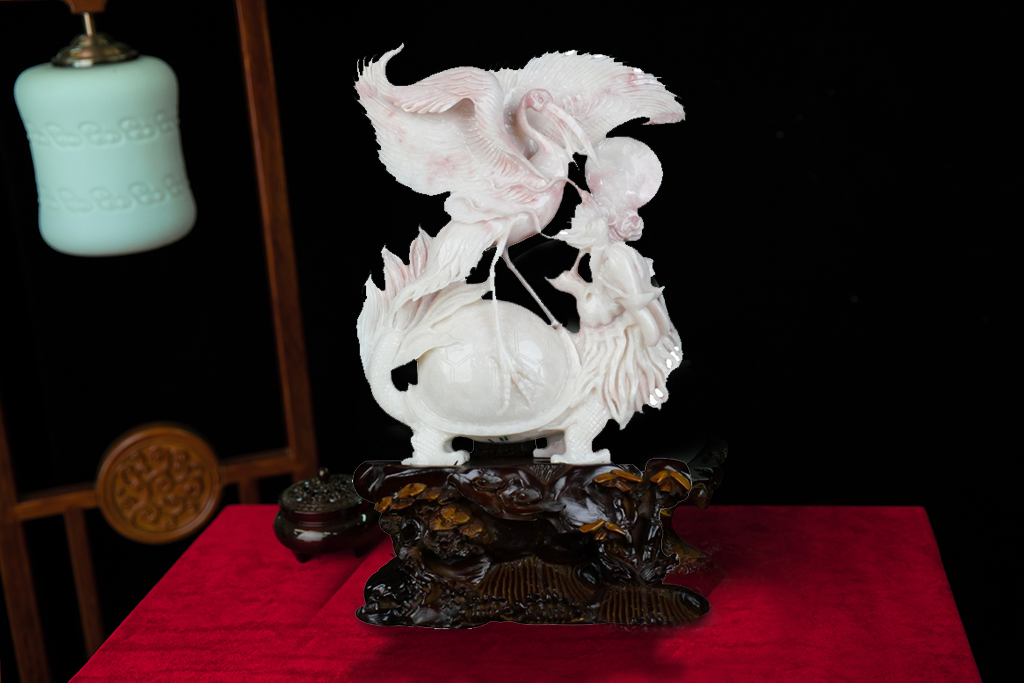 粉翠又称“桃花石”。据宋乾道《四明图经》记载:“相传安期生学道炼丹于此,尝以醉墨洒于山石上,遂成桃花纹,奇形异状,宛如天然,人多取之珍玩。”粉翠花纹面积较大,呈致密块状集合体,像开满桃花的桃花树枝,又疑为古代蕨类植物遗迹化石,质地细腻、耐观赏。适合加工成上乘的玉雕艺术品加以收藏。